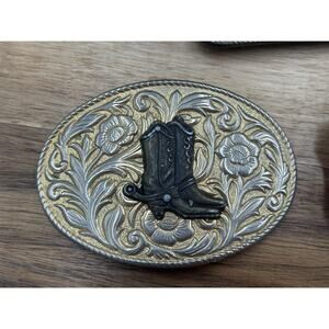 Designs: One oval buckle with raised cowboy boot and spur over floral scrollwork; one shield-shaped buckle with raised horseshoe and ornate scroll details; one rectangular buckle with raised horse head over decorative foliage