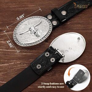 Removable Alloy Buckle: Snap system for interchanging buckles making it for anyone everyday use and different occasions: a country concert, cowboy theme birthday gathering, rodeo etc. Embossed cowboy belt leather fits through regular 1.37" wide belt loops on jeans. Different styles of buckle can also be changed at any time. Buckle Width 2.95”,length 3.93”.