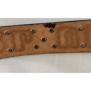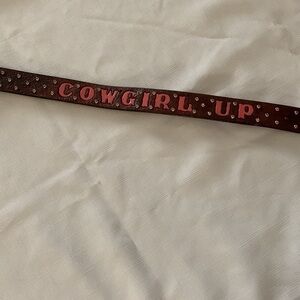 Western Belt Girls, Size 27”, Brown Leather. Tooled “Cow Girl Up”. Fits waist size 22.5” to 24.5”. Missing a rhinestone between W & G. Otherwise Good Condition. 382