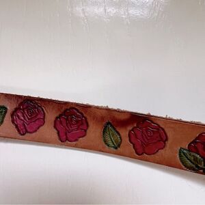 Hand stamped western style leather belt features the name “Margine” across the back and roses on either side. Cool buckle with lots of detail.