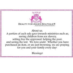 Please note: Beauty for Ashes Boutique® and Beauty for Ashes® carries t-shirts, worship flags, clothing, jewelry and accessories; many with our trademark brand name 'Beauty for Ashes' - which means God will restore Beauty in place of life's ashes - Isaiah 61:3. None of our items carry literal ashes. Instead, our items carry the blessings of God representing restoration and divine destiny for each individual.