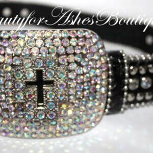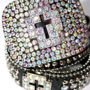 Amazing bling with aurora borealis crystals embedded in this belt buckle featuring a cross in the center. Genuine leather in black with aurora borealis rainbow crystal embedded crosses. Silvertone metal beading is featured on the top and bottom of the belt edges. Measuring 36" - 41" in size ML, and 32" - 37" in the SM. Width is 1 1/2". Removeable Belt Bling Buckle measures 3" x 3 1/2".