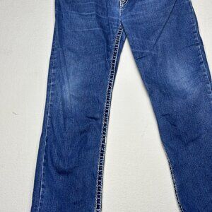Women’s size 30 blue denim jeans — embroidered detailing, bootcut fit, western indie rock style with faded wash.