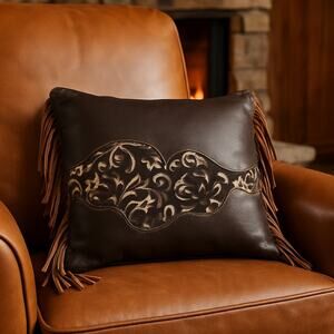 western, rustic lodge, cowboy chic, cowhide, embossed leather, farmhouse decor, bohemian, southwestern, fringe pillow, country home, cabin, handcrafted leatherwork, artisan design, rodeo style, rustic luxe, reclaimed western, cottagecore, y2k boho, handmade, vintage-inspired, fall decor, gift idea
