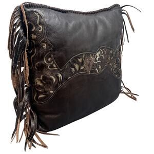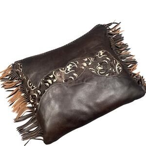 Western Brown Leather Pillow Fringe Cowhide Accent Embossed Floral Rustic Boho