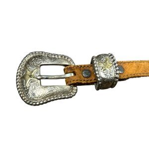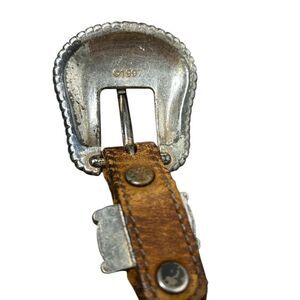 Western style brown leather belt with silver buckle and conchos. Conchos have a star detail