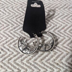 These stunning silver hoop earrings feature an intricate design, perfect for adding elegance to any ensemble.