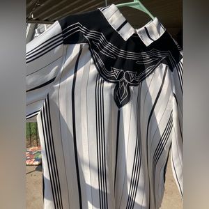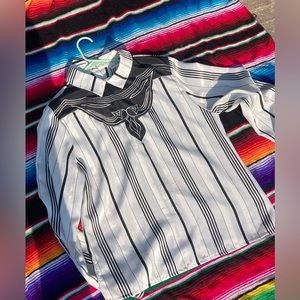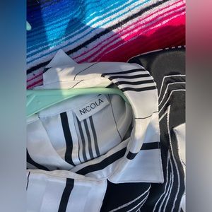 Super cool black and white 80’s satin-y poly top from Nicola. Has a western embroidered detail on the back, buttons down the front. Super bold graphic babe.