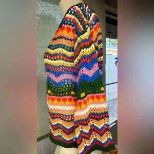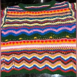 Western Chevron patterned crochet sweater with rolled neck. Size: S Bell sleeves, polyester, easy care, colorful, Boho Hippie Haute Couture. Pit-pit: 22”, Shoulders: 20”, Length: 21”… Gently pre-loved with no significant signs of wear! CLEAN! Runs LARGER than stated size.