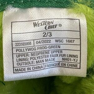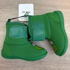NEW with Tags- Little ones will leap into froggy fun in Fritz the Frog easy on off hard sole cold weather booties. Easy to clean neoprene upper. Cushioned foam fleece insole keep little feet comfortable. Matching green soft faux fur strap and EVA fleece lined insole keeps them cozy warm. Back pull tab for easy on/off. Soft outside sole in forest green has injected TPR outsole for gripping traction, Hard sole cold weather boot, Flexible neoprene upper, EVA fleece insole, Faux fur lining, Injected TPR outsole