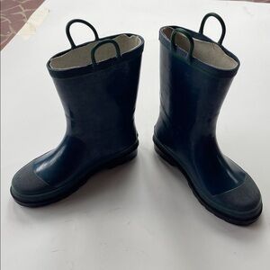 Durable dark blue boots with sturdy black soles. Ideal for wet weather. Kids US size 3, European size 34. Worn, but good shape. Long lasting. Utilitarian. Loops on top make it easy to take on/ off.