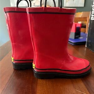 Vibrant red rain boots for kids. Perfect for wet weather. Durable and comfortable.