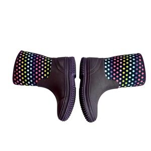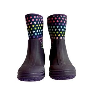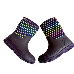 Brighten up rainy days with these adorable little kid Western Chief Rain Boots! Great pre-owned condition. Minimal wear with minor scuffing and some wear on back heal of bottom soles. See pics for reference. Featuring a durable rubber lower half and a colorful rainbow polka dot neoprene upper, these boots are perfect for splashing in puddles and keeping little feet warm and dry. Designed for comfort, warmth, and easy slip-on wear, they’re great for any toddler on the go. Ideal for rainy weather, muddy adventures, or winter slush.