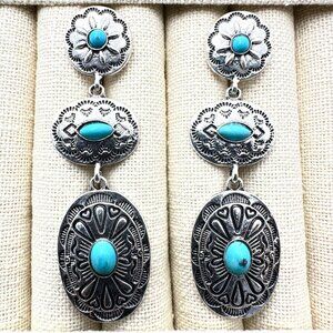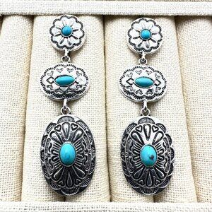 Western Concho style earrings with a silver tone and blue faux turquoise accents. These 3-inch pierced earrings are perfect for adding a touch of southwestern flair to any outfit. Lightweight and easy to wear, they are great for daily wear or special occasions.