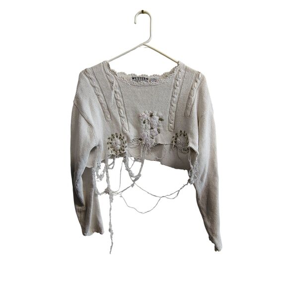 Western Connection Women's Large White Distressed Knit Crop Long Sleeve Top