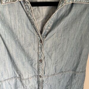 Chic sleeveless button-down by Ecru. Light blue hue. Ideal for layering or wearing solo. This top is versatile and can be worn with white shorts or dressed up. Fits like a size medium. Unique pleated details on the back of shirt.