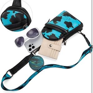 NWT small sling bag in a cute black and blue cow print!⭐️Made from premium vegan leather, this sling bag is both durable and water-resistant, perfect for daily use and outdoor adventures. Dimensions: 7.6" x 1.7" x 5" (Strap 34-54").