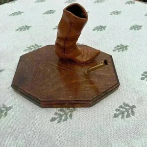 Add a touch of rustic charm to your home or office with this unique Western-themed cowboy boot pen holder! Featuring a detailed brown boot made of resin, mounted on a finished wood base with a brass-tone pen holder, it’s the perfect accent for lovers of Southwestern or country style.