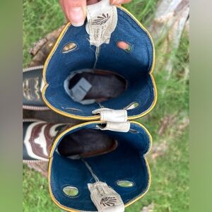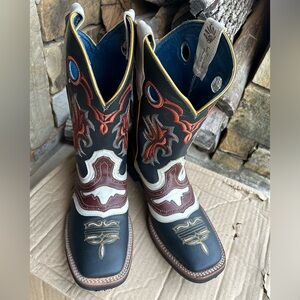 Vibrant San Fernando cowboy boots with intricate rust colored embroidery detail. Features black, brown, and cream colors. Rubber sole & square tip. Made in Mexico. New boots with box.