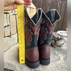 Vibrant San Fernando cowboy boots with intricate rust colored embroidery detail. Features black, brown, and cream colors. Rubber sole & square tip. Made in Mexico. New boots with box.