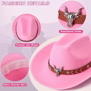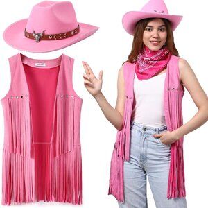 Features: Cute and versatile cowgirl set includes a pink faux suede fringe vest with a slim fit and long fringe details, a classic pink cowboy hat with an adjustable size for a comfy fit, and a matching scarf to complete the look. Perfect for playful events, photoshoots, or just adding some Western flair to everyday style.
