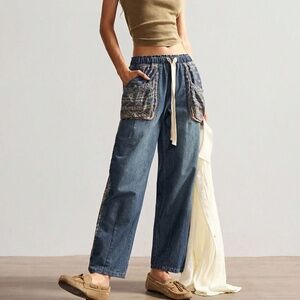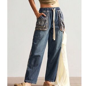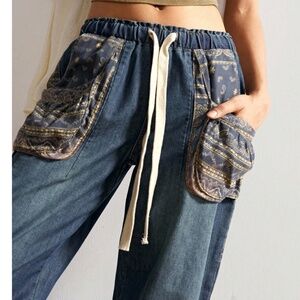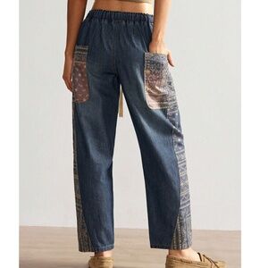 Western Dark Wash Paisley Print Stretchy Waist Straight Leg Denim Pants