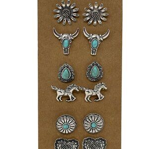 What You Get - 6 pairs of Western style earrings featuring turquoise-inspired stones, concho flowers, mini longhorns, hearts, and boots—perfect for anyone who loves cowgirl, boho, or rustic fashion.