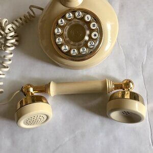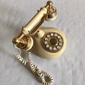 Add a touch of timeless elegance to your décor with this vintage push-button telephone styled to look like a classic rotary. Featuring a cream ivory body with polished brass accents, it’s perfect for vintage-inspired interiors, photo shoots, and authentic movie or stage props.