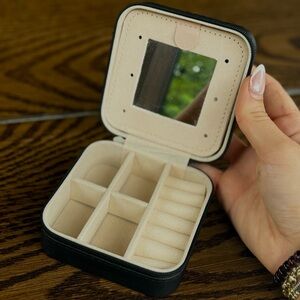 Store your accessories in style with this elegant black and silver embossed box. Perfect for keeping your essentials organized. Black and silver etched with zipper.