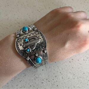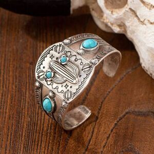 Western Fake Turquoise Stone Decor Cactus Concho Metal Cuff Bangle Bracelet