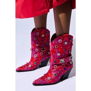 Western Flower Embroidered Cowgirl Boots Red Rhinestone Chunky Heel Women
