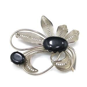 Western Germany Black & Silver Floral Brooch, Black Glass Cabochons, 1950s