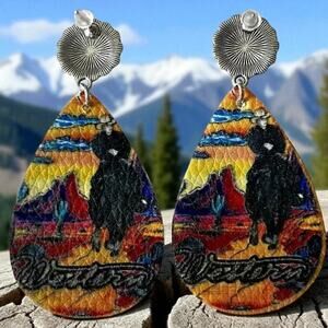 Western script, horse, cowboy, desert, cactus, mountain, sunset