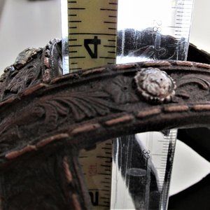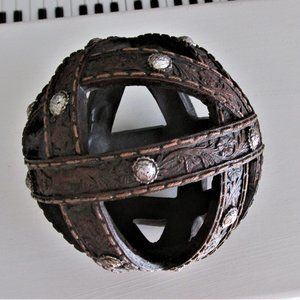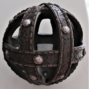 Western influenced ceramic ball depicting leather and silver conchos. Versatile decorator item.