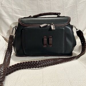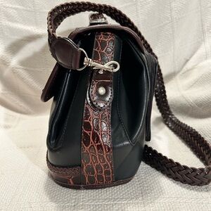 This crossbody bag features a sophisticated mix of dark brown crocodile-textured leather and smooth black leather, accented with silver-toned hardware. Its structured design and braided leather strap provide a stylish and functional accessory for any occasion.
