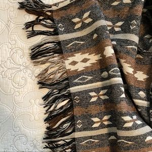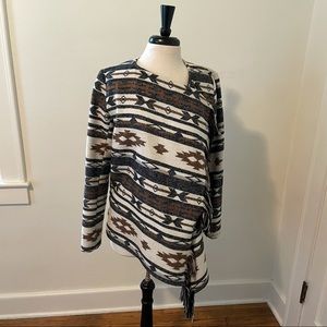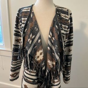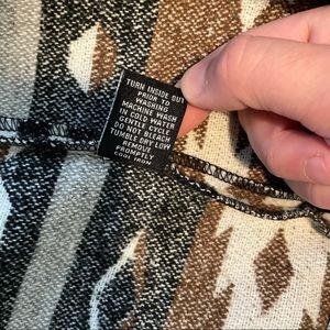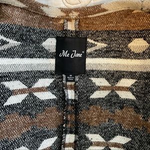 Great condition, nothing ruined, worn a few times. This jacket feels like a thick wool but it’s easy to care for polyester! No snaps, but hangs open or wrap closed like a blanket. Would look cute with a pin fasten or belt.