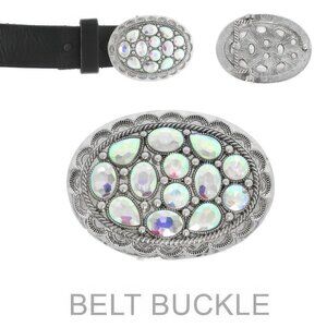 Make a sparkling statement with this Western oval belt buckle, featuring multi-cut crystals and a scalloped edge design. Crafted to catch the light from every angle, this silver-tone accessory instantly elevates any look with refined rodeo glam. Its vintage-inspired silhouette and luxe crystal detailing bring an air of rustic elegance to denim, dresses, or layered Western outfits. Bold yet polished, it’s a stunning way to showcase your love for timeless cowboy style. Note: This listing includes the buckle only.