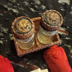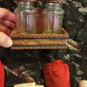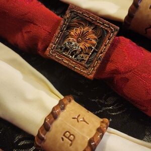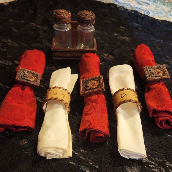 5 cloth napkin holders, 2 cream and 3 burgandy, with western theme going around the holder!! Also a western salt n pepper shaker that is removable if u want to be!!! ALL VERY, VETY NICE!!!!!!