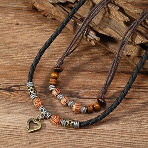 Western Layered Boho Wood Beads Choker Necklace Luck Copper Coins Heart Shaped F