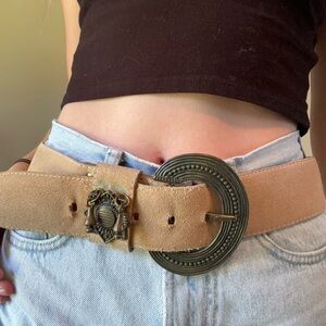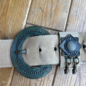 Leather belt with detailed brass buckle and charm detailing. Amazing quality belt! Some wear around the belt holes but otherwise in great condition!