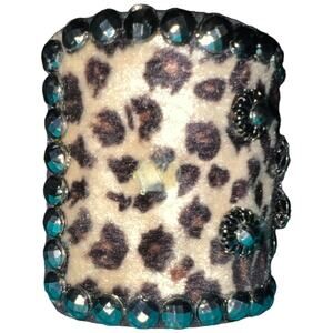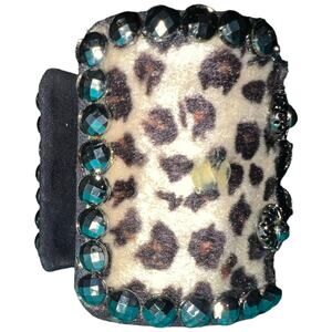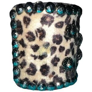 This eye-catching statement cuff combines wild leopard print with sparkling turquoise crystals and a bold floral medallion centerpiece. The 2.75-inch wide cuff features a black base with cream and brown leopard spots, embellished with faceted turquoise-colored crystals around the edges and an ornate metal flower design. The adjustable cuff has a 7.25-inch diameter with a 0.25-inch gap for comfortable fit. Note: Two crystals missing from edge trim. The dramatic width and mixed-media design create a striking bohemian look perfect for western-inspired or festival fashion. A unique piece that blends animal print with rhinestone glamour.