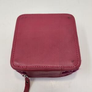Western Linens cowhide leather square jewelry case box, zipper closure, divided insert, small pouch pocket and button straps, measures approximately 5.5" x 5.5" x 3.5"