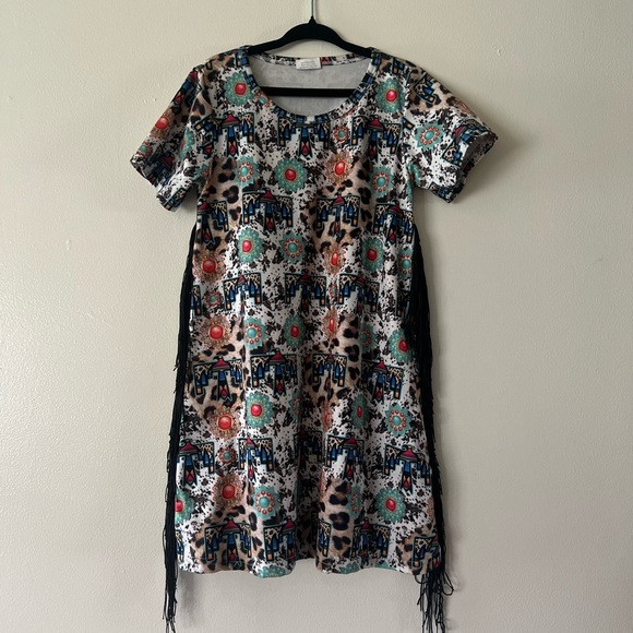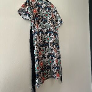 This vibrant kids' casual dress features a colorful floral pattern, perfect for any occasion. The dress combines shades of red, blue, and green, creating a lively and playful look. Ideal for everyday wear, this dress offers comfort and style.