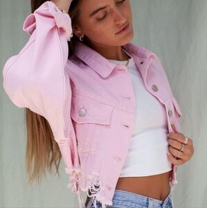 Stylish distressed pink cropped denim jacket with frayed hem. Perfect to go with any Western attire. pair with your favorite jeans and boots for a night out country dancing.