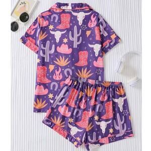 Western Print Pajama Set Purple Cowboy Boots Cactus Skulls Women’s Shorts M NWT