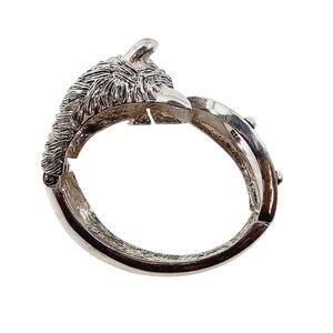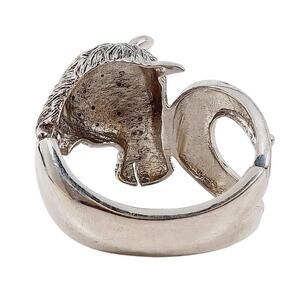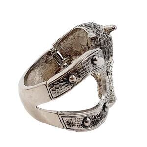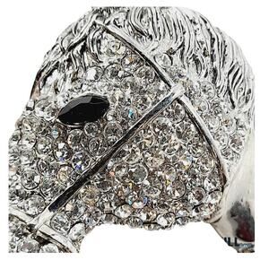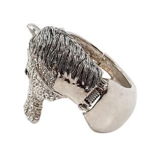 Stunning 7" silvertone cuff bracelet featuring a bold horse head encrusted with sparkling rhinestones and a textured horseshoe design. Heavyweight and hinged for easy wear, this piece gives rodeo glam, equestrian elegance, and a dose of Y2K statement energy. Perfect for concerts, festivals, themed events, or anyone obsessed with cowboy-core and Western fashion. Unmarked but designer quality in weight and craftsmanship.