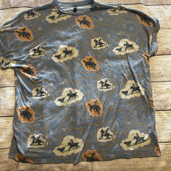 Discover elegance with this women's graphic tee, featuring a captivating design in gray and brown hues. Perfect for adding a touch of sophistication to your casual wardrobe. Great condition no holes or rips. Lots of stretch if needed. Fun cowboy print