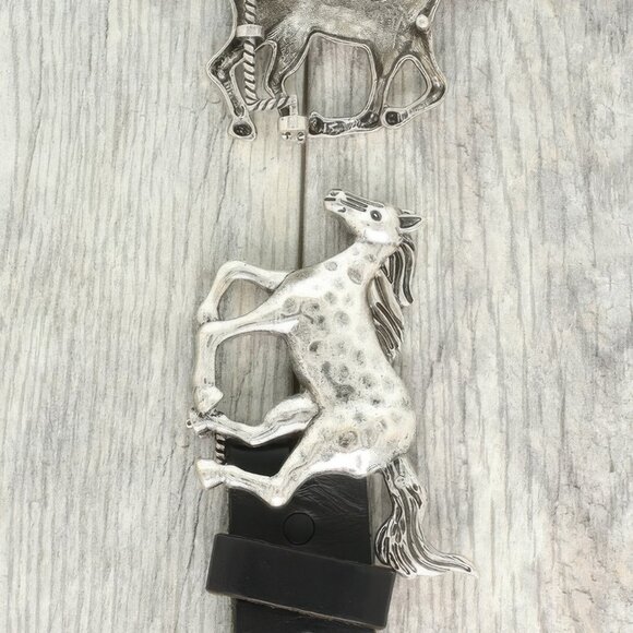 Capture the spirit of the West with this bold running horse concho belt buckle. Crafted in silver-tone metal, it features a dynamic galloping horse design that symbolizes strength and freedom. With its vintage-inspired detailing and statement size, this piece brings energy and character to any outfit. Whether paired with distressed denim or layered over a dress, it’s a versatile accessory for cowgirls and cowboy enthusiasts alike. Note: This listing includes the buckle only.