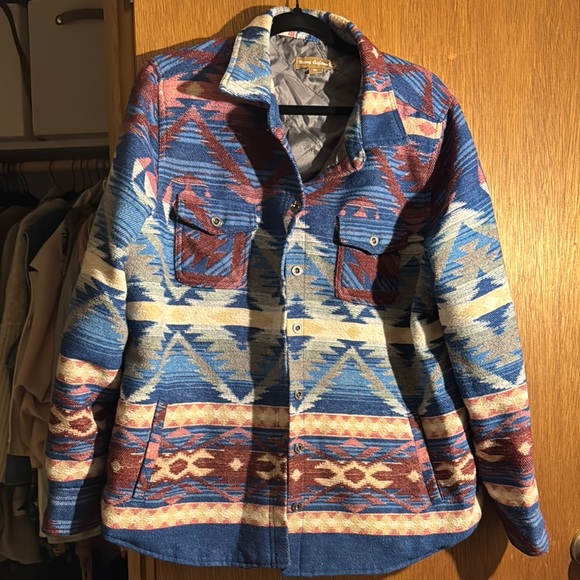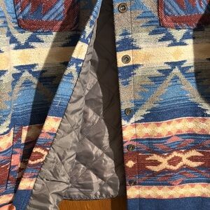 Vibrant jacket with a striking geometric pattern. Features shades of blue, red, pink, and cream. Has a light lining for insulation.