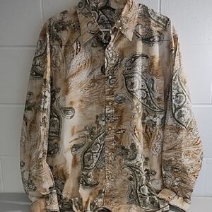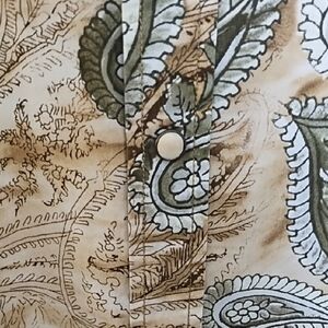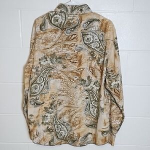 Elevate your style with this men's paisley print shirt. Featuring a sophisticated blend of green and brown, this shirt is perfect for any occasion. Pair it with your favorite wranglers for a polished look.